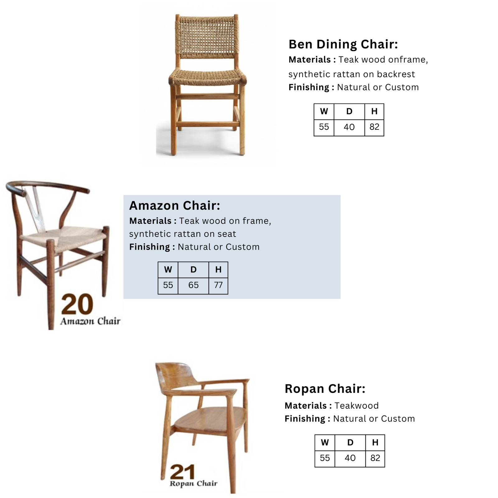 - Ropan Chair: Desain simple dan minimalis yang terbuat full dari kayu jati (teakwood). Sangat serbaguna dan tahan lama.