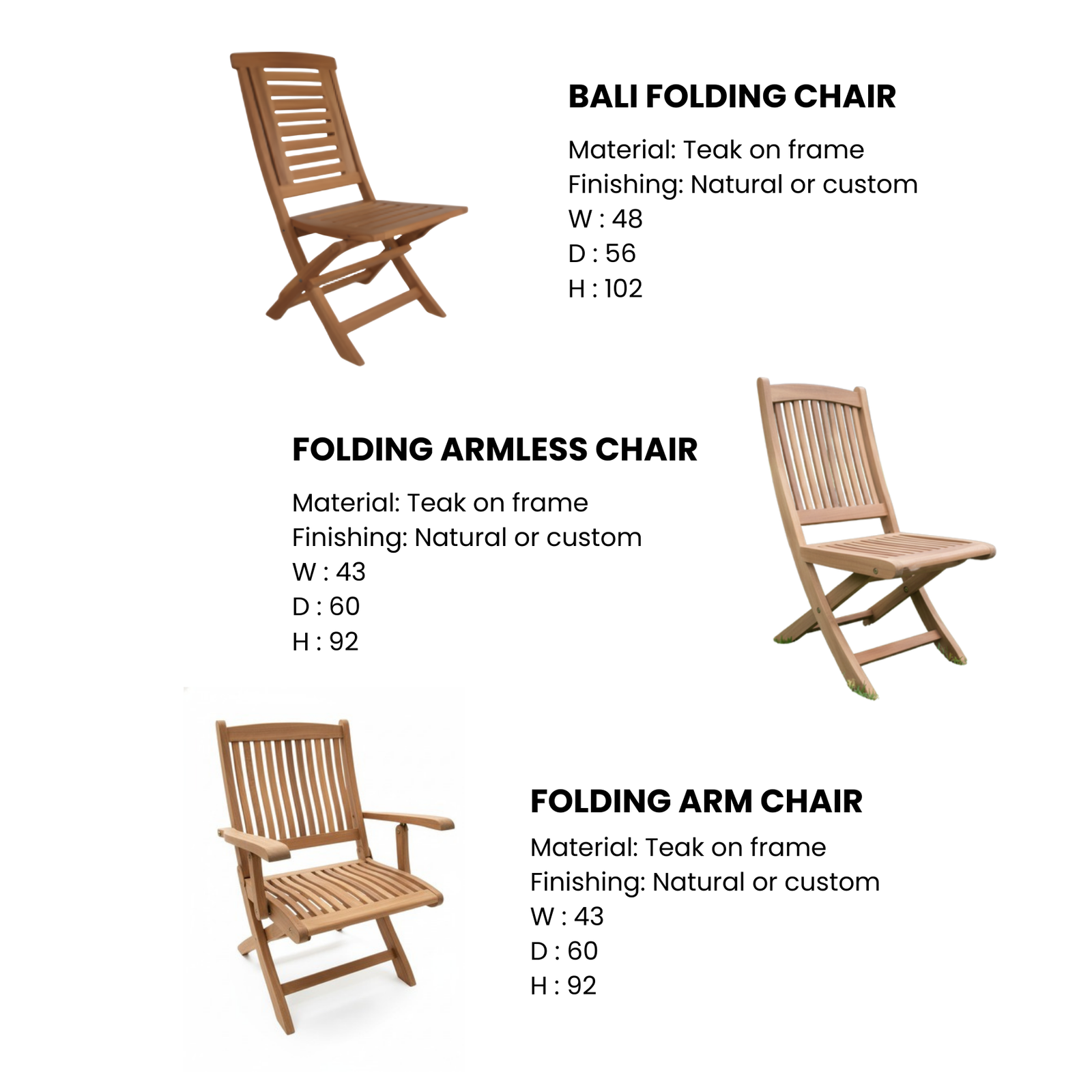 - Bali Folding Chair, Folding Armless/Arm Chair: Semuanya menggunakan frame kayu jati dengan opsi dengan atau tanpa sandaran tangan. Spesifikasi seperti "W: 48 D: 56 H: 102" untuk Bali Folding Chair menunjukkan desain yang tinggi dan ramping. Keunggulan kursi lipat jati dibanding plastik adalah kesan premium, stabilitas lebih baik, dan umur pakai yang jauh lebih panjang.
