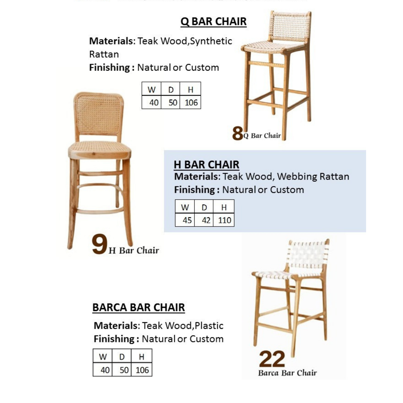 - H Bar Chair: Menggunakan kayu jati dan webbing rotan. Desain tinggi klasik dengan sandaran, menawarkan kenyamanan dan estetika.