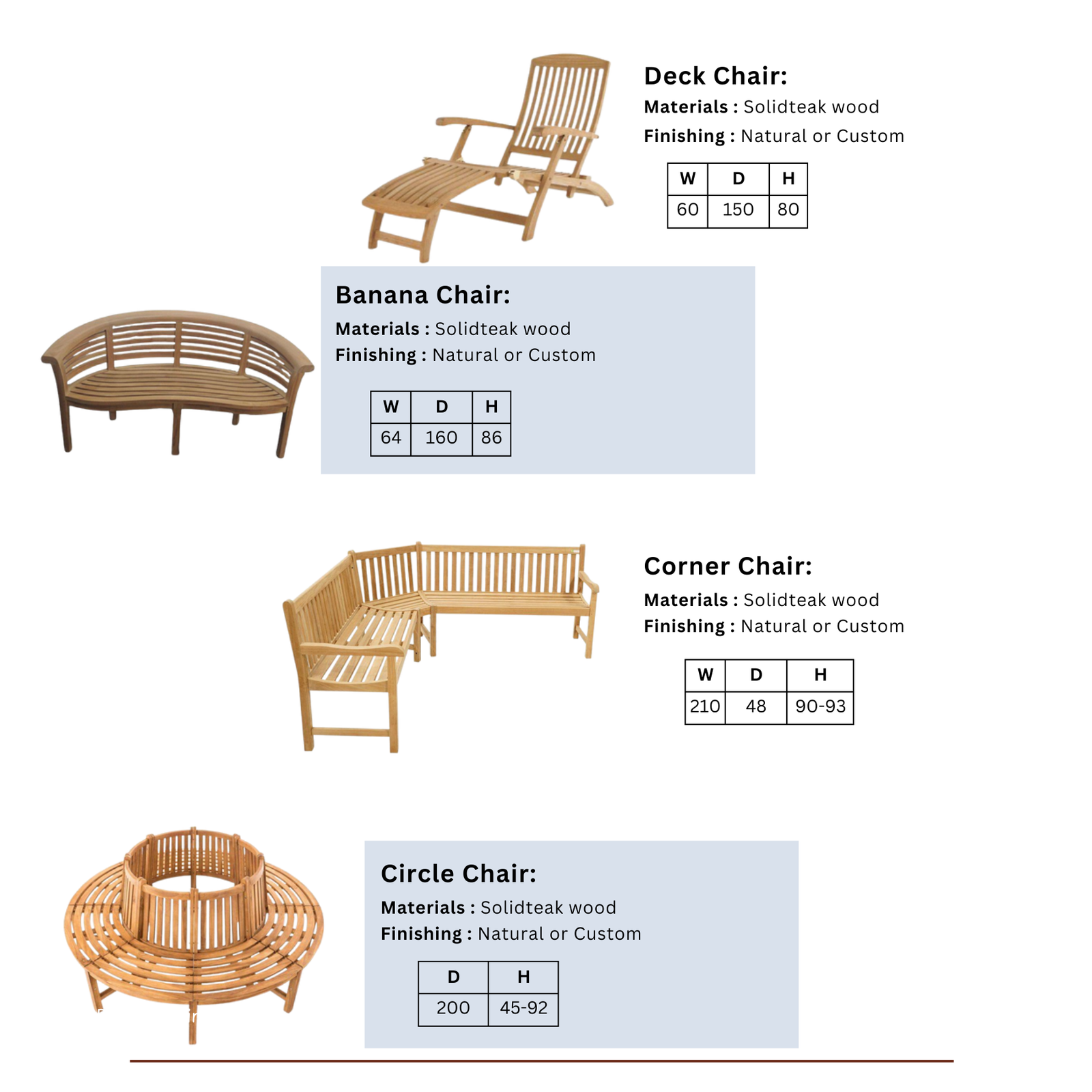 Perusahaan menawarkan beragam model kursi taman dari solid teak wood, yang terkenal sangat tahan terhadap segala cuaca, kelembaban, dan serangga.